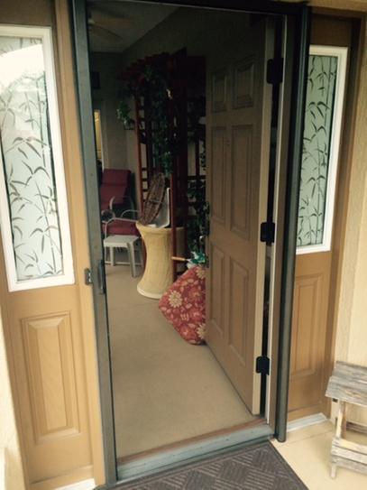 1 ccheck trimheck trim mmake sure there is a flake sure there is a fl at surface on the door trim to mount screen at surface on the door trim to mount screen aand track to nd track to. Like hinged screen doors. Speed reducer to prevent door from banging when opened. Stripe in screen at eye level prevents walking into it.